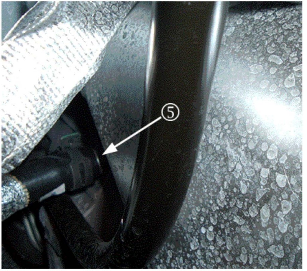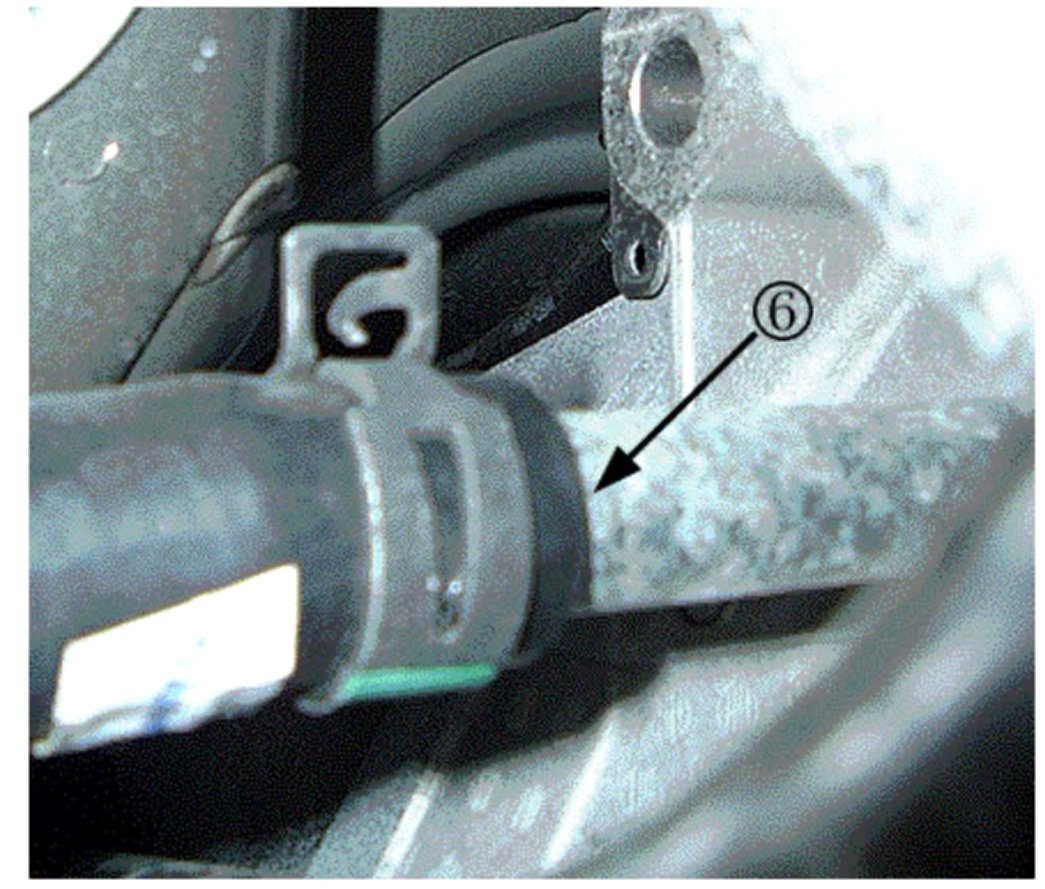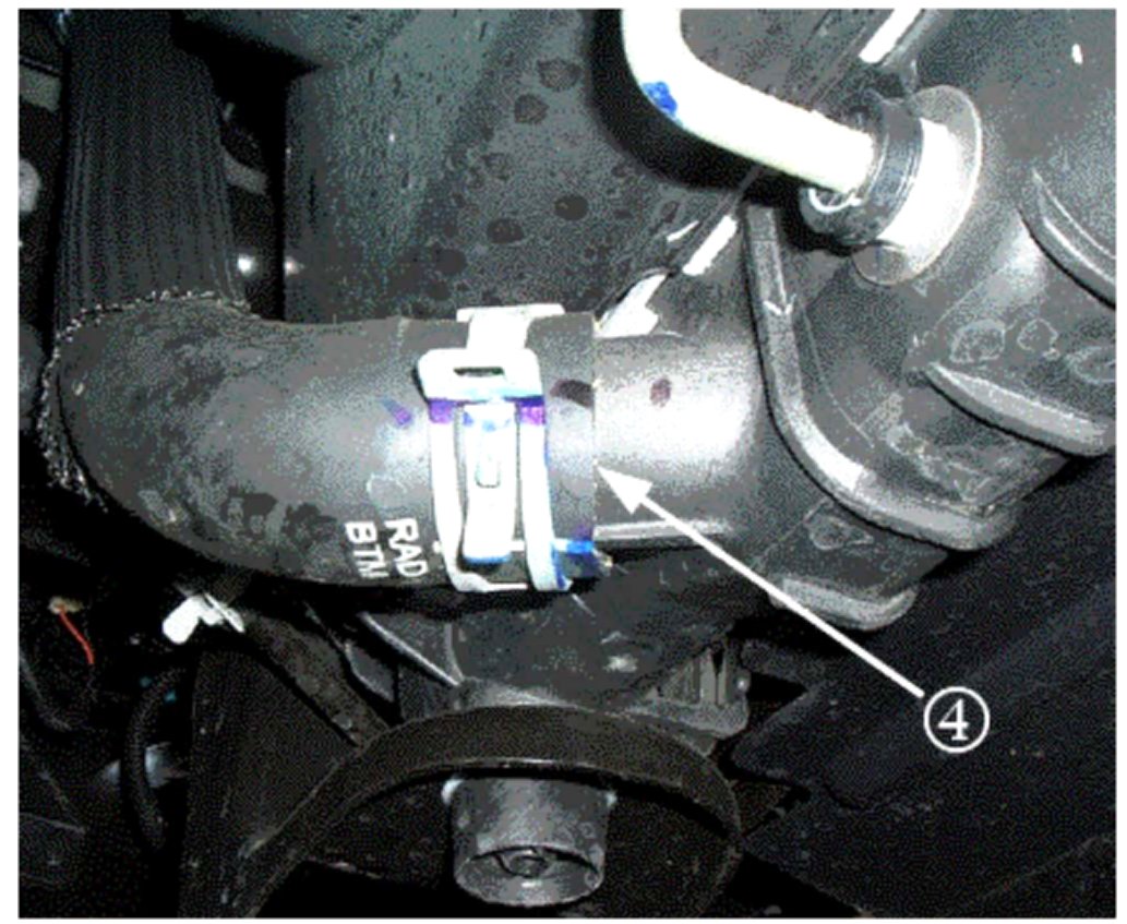 4. Radiator outlet hose (lower hose) to radiator (4). (Shown as viewed from below.)