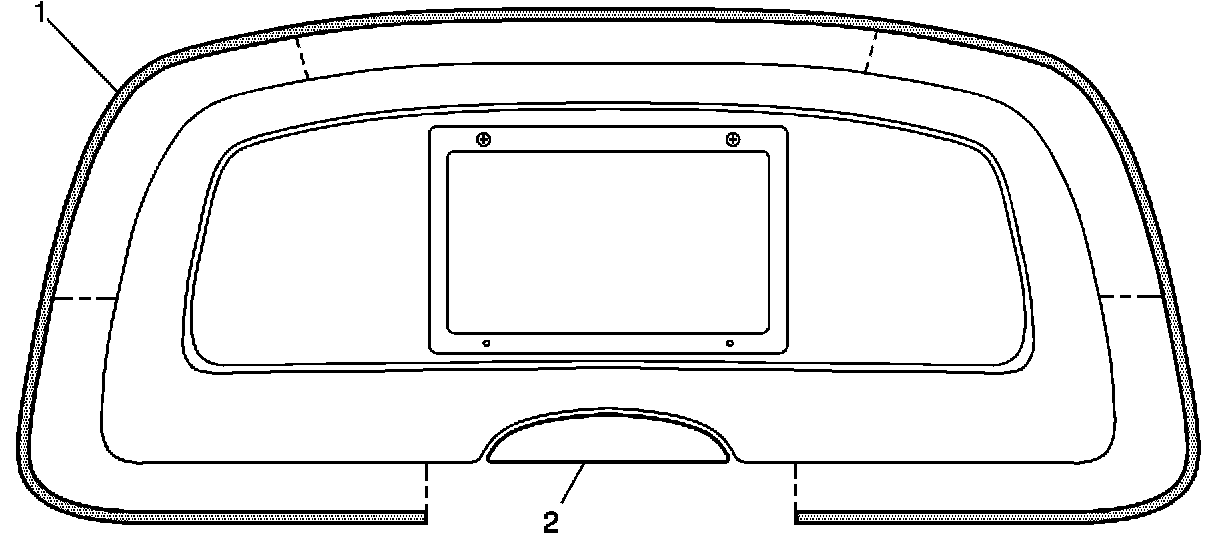 Install a new license plate pocket perimeter gasket onto the backside edge of the pocket housing as shown above, starting at the middle of the seal at the top center of the pocket. This will ensure that the seal will be even. When properly installed, there will be 25-50 mm (1-2 in) on either side of the liftgate release handle (2) that the seal (1) does not reach. DO NOT attempt to install the seal on the liftgate directly below the release handle.