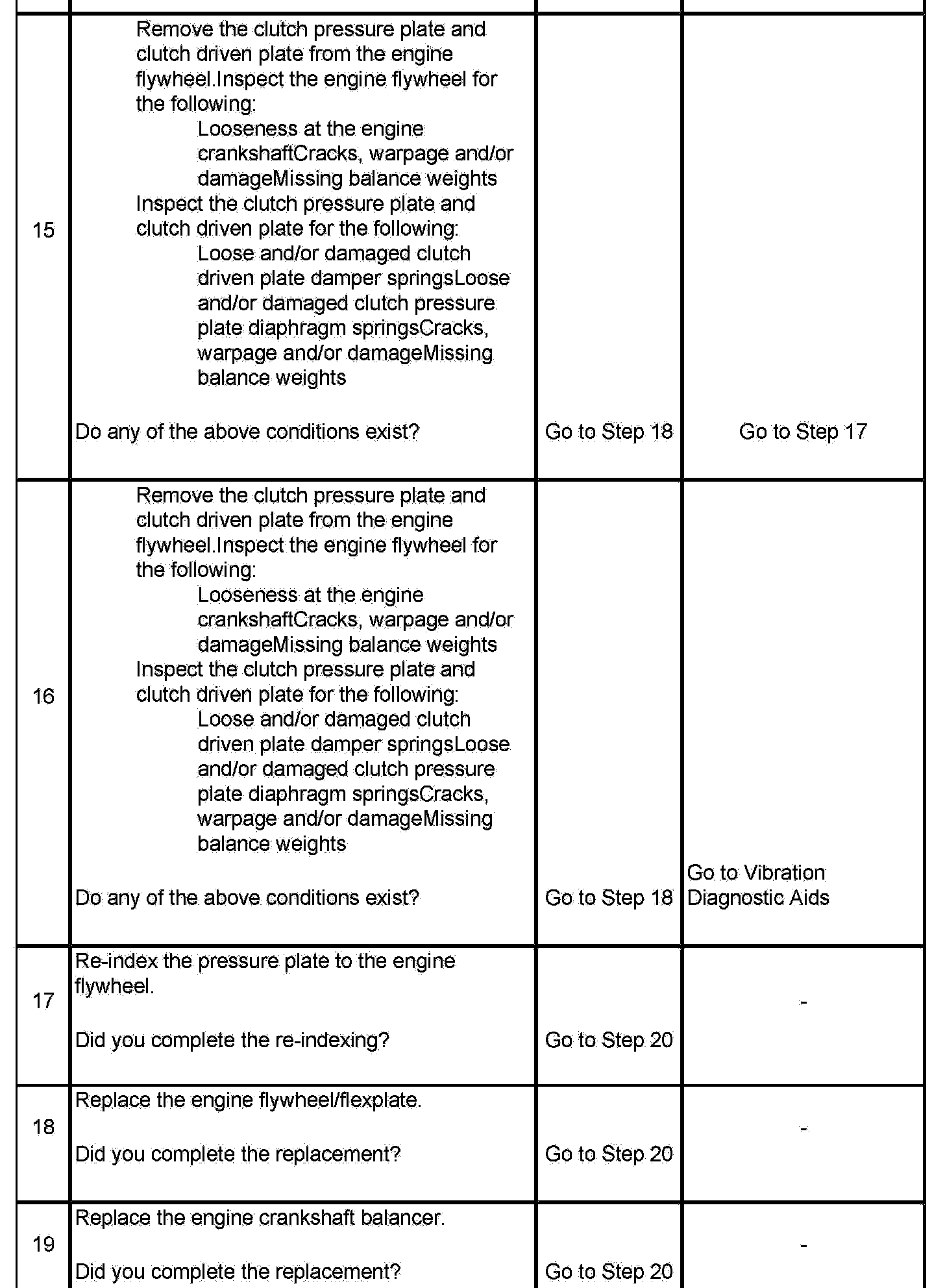 15. An engine flywheel that is loose at the engine crankshaft or that is cracked, damaged and/or missing balance weights; and/or a clutch pressure plate and clutch driven plate that has loose springs, cracks, warpage, damage and/or missing balance weights - can produce a disturbance when their mass is combined.