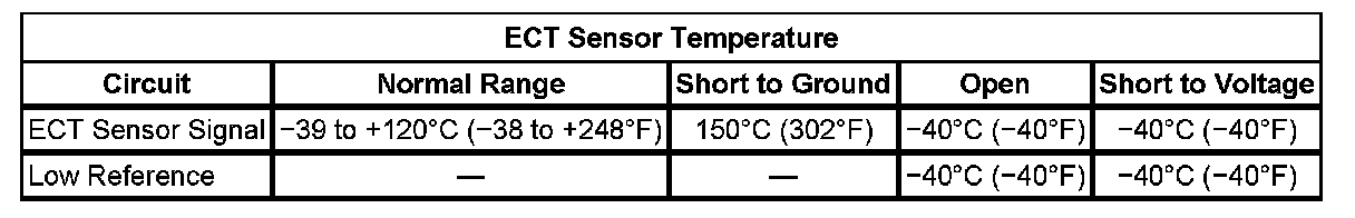 The engine coolant temperature (ECT) sensor is a variable resistor that measures the temperature of the engine coolant. The engine control module (ECM) supplies 5 volts to the ECT signal circuit and supplies a ground to the low reference circuit.