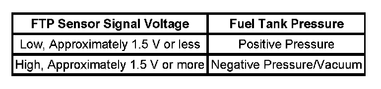 1. Ignition ON and fuel cap removed, verify that the FTP sensor parameter is between 1.3-1.7 volts.