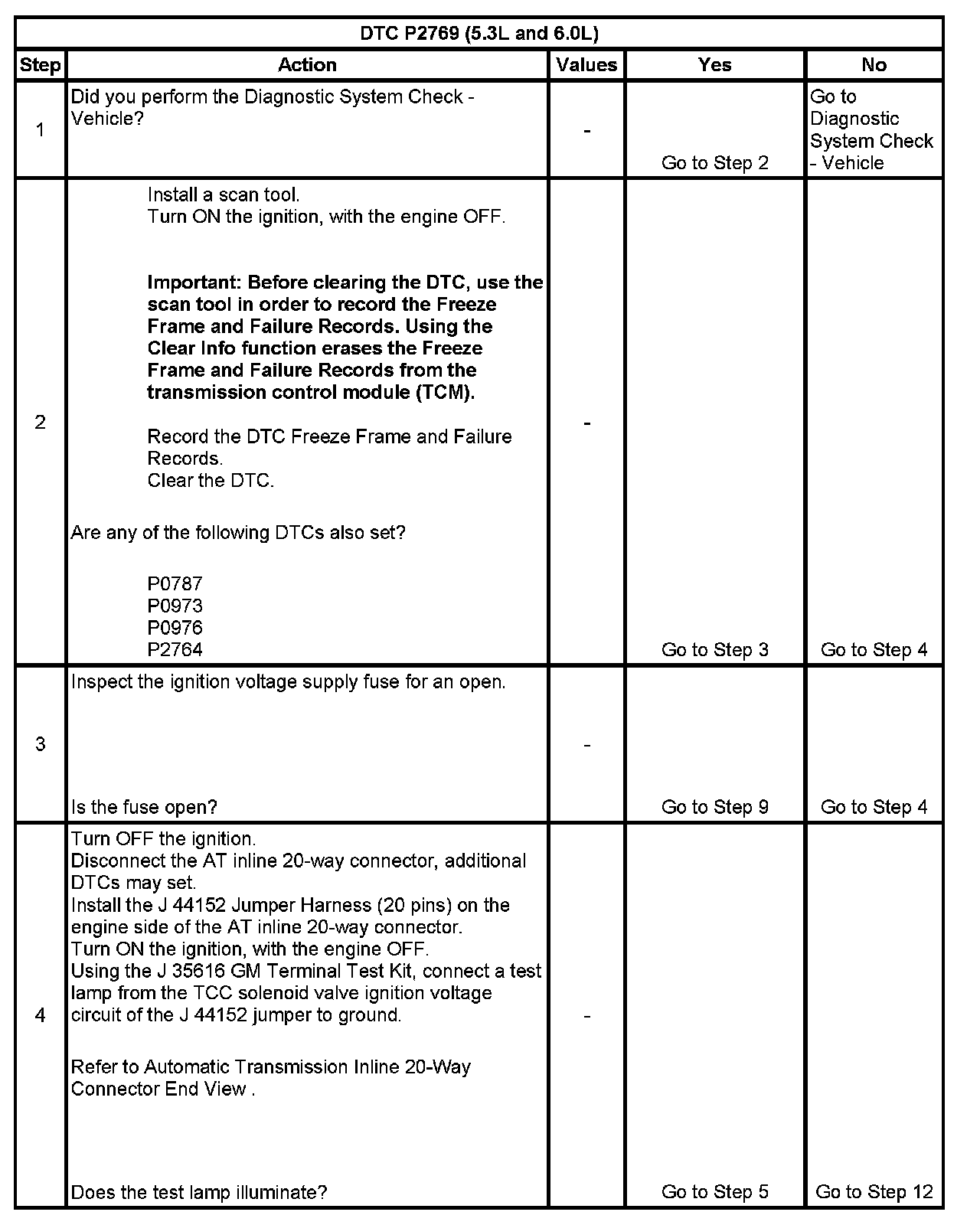 When the TCM detects a continuous open or short to ground in the TCC solenoid valve control circuit, then DTC P2769 sets. DTC P2769 is a type B DTC.