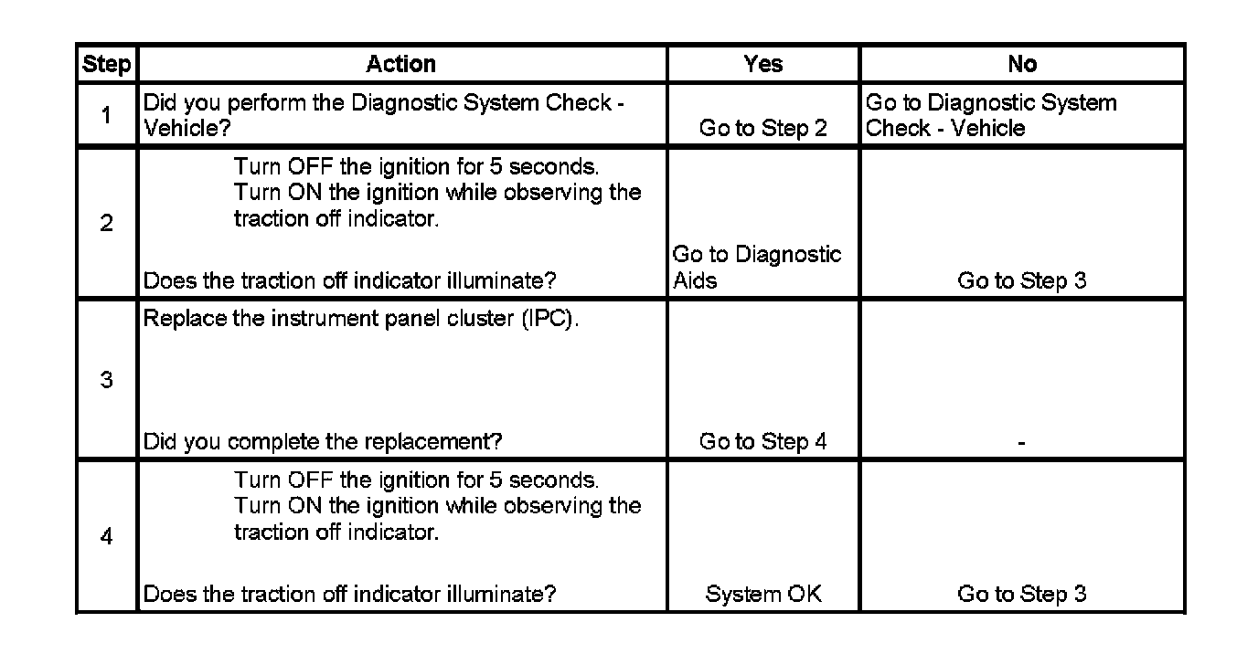 The instrument panel cluster (IPC) illuminates the traction off indicator by supplying ground to the lamp. The electronic brake control module (EBCM) sends serial data messages to the IPC to command the indicator ON or OFF.