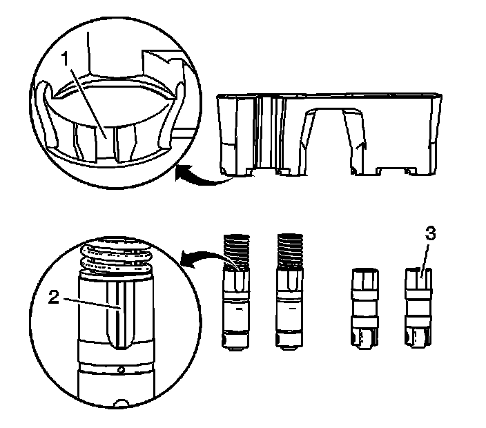 ^ Align the flat area (3) on the top of the non-active fuel management lifter with the flat area in the lifter guide bore. Push the lifter completely into the guide bore.