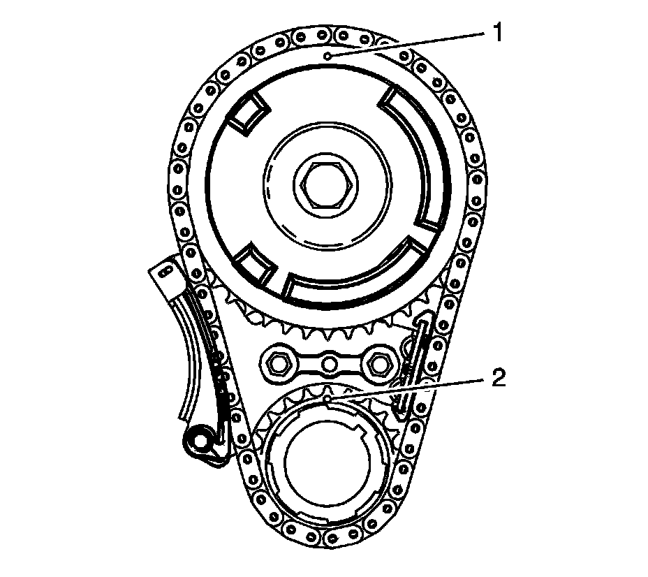 In this position, cylinder number 1 rocker arms will be off lobe lift, and the crankshaft sprocket key will be at the 1:30 position. The camshaft and crankshaft sprocket alignment marks (1, 2) will be in the 12 o'clock position. If viewing from the rear of the engine, the additional crankshaft pilot hole, non-threaded, will be in the 10:30 position.
