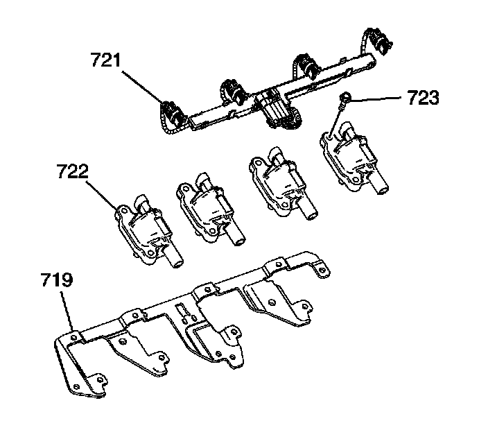 3. Apply threadlock GM P/N 12345382 (Canadian P/N 10953489), or equivalent, to the threads of the ignition coil bolts (723).