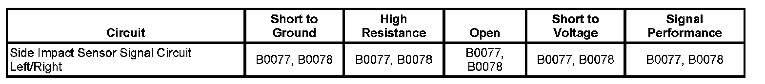 The inflatable restraint side impact sensor (SIS) utilizes a unidirectional 2-wire circuit. The SIS modulates current on the interface to send ID, State of Health, and deployment commands to the inflatable restraint sensing and diagnostic module (SDM). The SDM serves as a power source and a ground for the SIS. When the ignition is turned on and input power from the SDM is first detected, the SIS responds by performing internal diagnostics and sending an ID to the SDM. The SDM considers the ID to be valid if the response time is less than 5 seconds. The SIS continually communicates status messages to the SDM, which determines if a fault is present in the SIS circuit. When a fault is detected, the SDM resets the SIS twice by removing and reapplying power. If the fault is still present, the SDM will set a diagnostic trouble code (DTC).