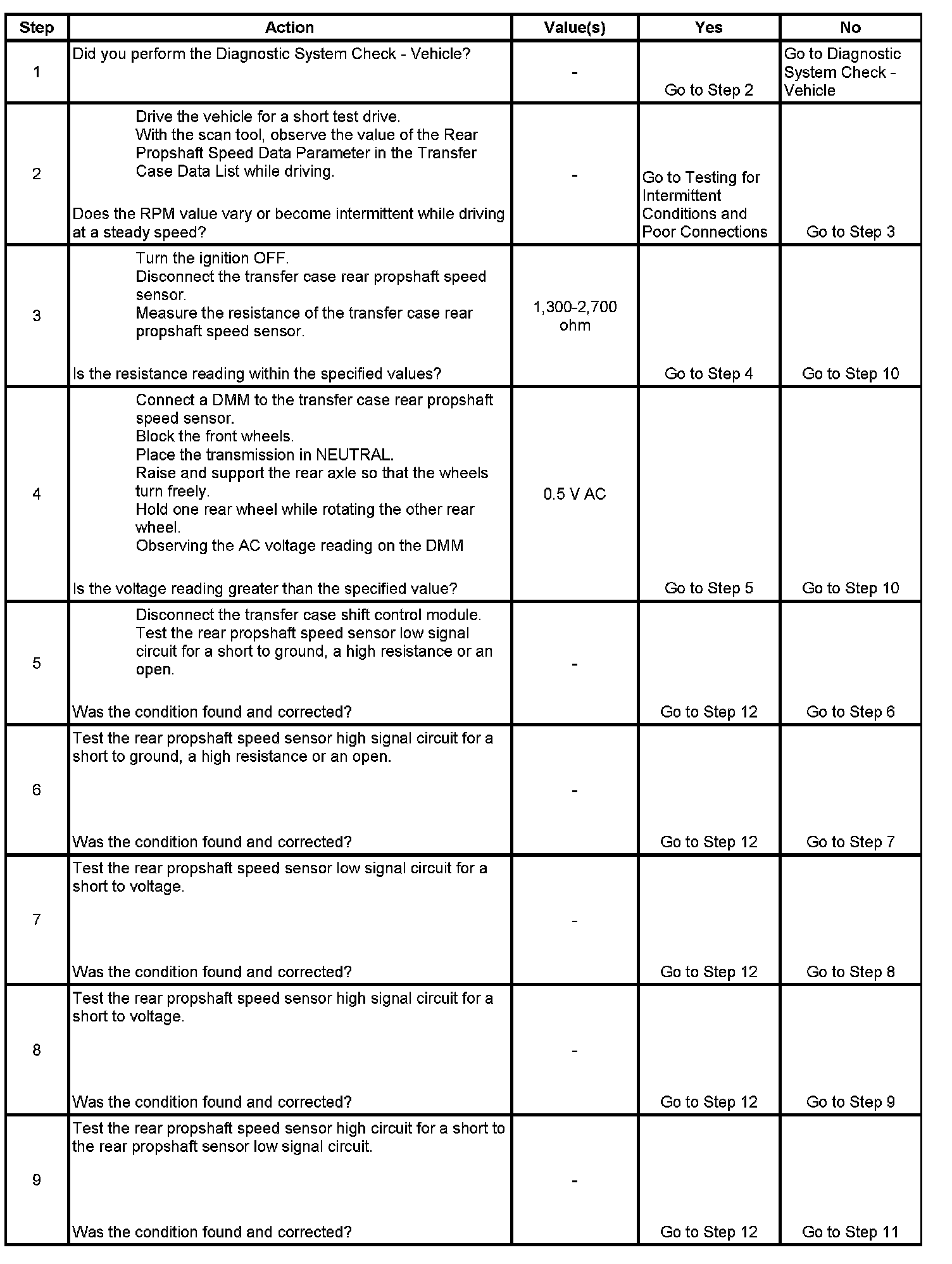 9. This step tests the rear propshaft speed sensor low circuit for a short to the rear propshaft speed sensor high circuit.