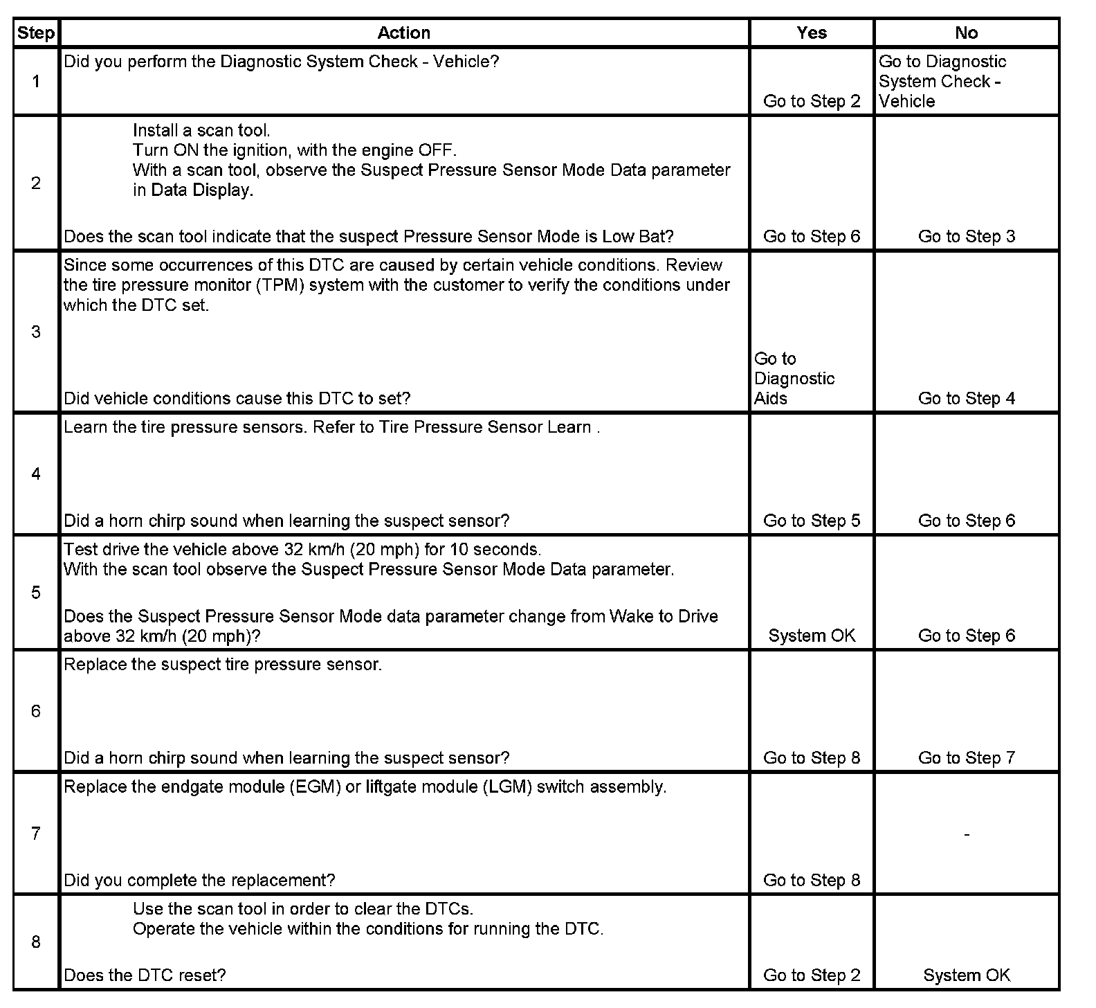 ^ Occasionally sensors can become mislocated due to previous tire rotations where the sensor learn procedure was not performed. Always learn the sensors to ensure the DTC set is for that actual physical corner of the vehicle. Refer to Tire Pressure Sensor Learn.