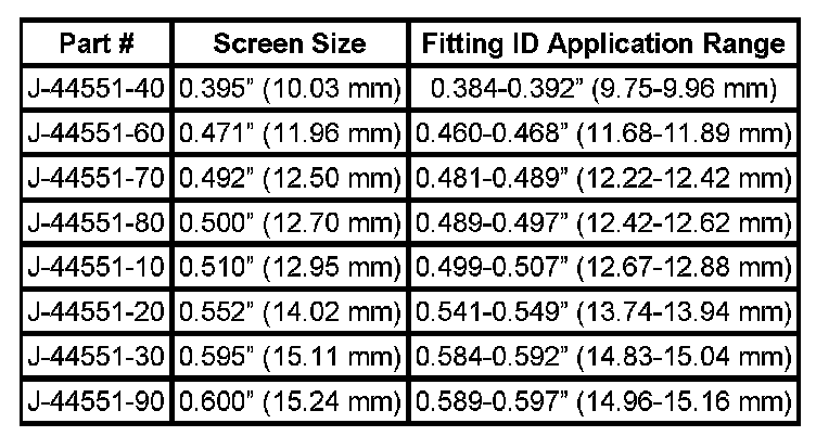 * The 0.471" (11.96 mm) Mandrel is only for the 0.471" (11.96 mm) screen in hose fittings with an internal hourglass shape where the screen installs at the recessed, reduced diameter point.