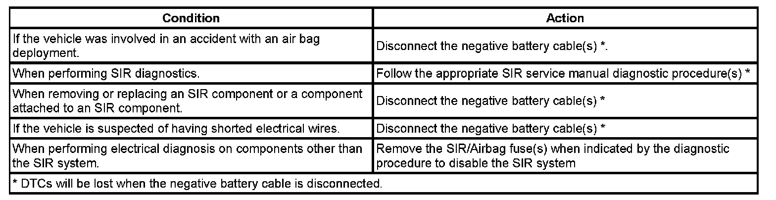 There are several reasons for disabling the SIR system, such as repairs to the SIR system or servicing a component near or attached to an SIR component. There are several ways to disable the SIR system depending on what type of service is being performed. The following information covers the proper procedures for disabling/enabling the SIR system.