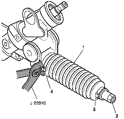 5. Slide the boot (1) towards the center of the gear assembly until the boot seats in the inner tie rod retaining groove.