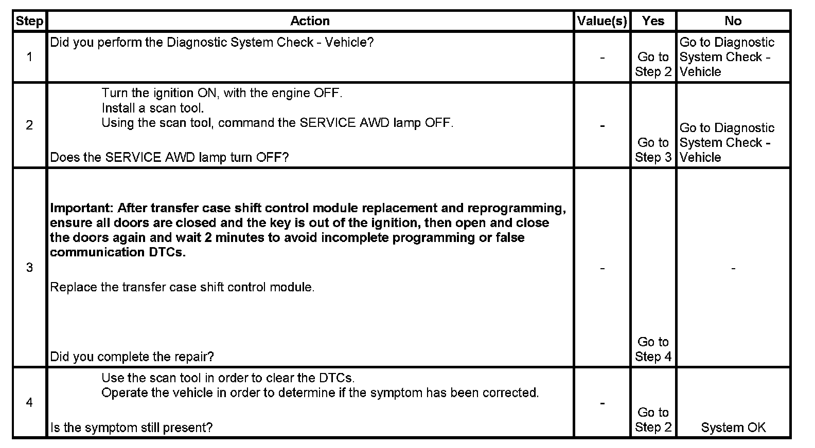 The SERVICE AWD indicator is located in the instrument cluster and shares the instrument cluster common power and ground. The transfer case shift control module controls the SERVICE AWD indicator by sending the instrument cluster a Class 2 message. This lamp may be controlled with the scan tool using the instrument cluster device controls.