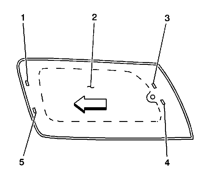 16. If installing a Chevrolet bodyside window (2), firmly press only at the 4 exterior points (1, 3, 4, 5) as indicated.