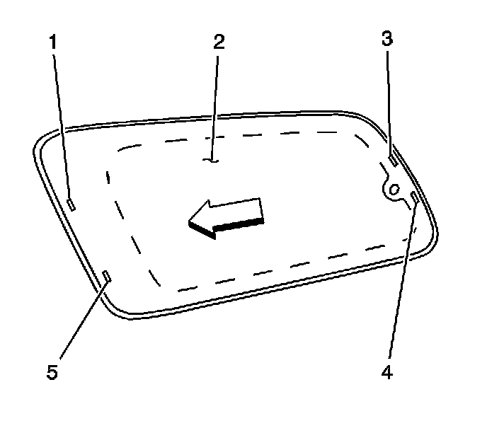 17. If installing a GMC bodyside window (2) firmly press only at the 4 exterior points (1, 3, 4, 5) as indicated.