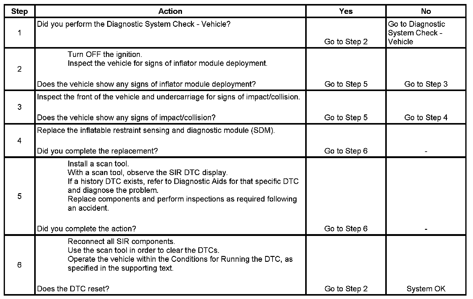 The inflatable restraint sensing and diagnostic module (SDM) contains sensing devices that converts vehicle velocity changes to electrical signals. The SDM processes the generated electrical signals and compares them to values stored in memory. When the generated signals exceed the stored values, the SDM performs additional signal processing and compares the generated signals to signals stored in memory. When 2 of the generated signals exceed the stored values, the SDM will cause current to flow through the inflator modules, deploying the inflator modules. DTC B0053 will set along with DTC B0051 when a deployment occurs while a circuit malfunction is present in any one of the deployment loops.