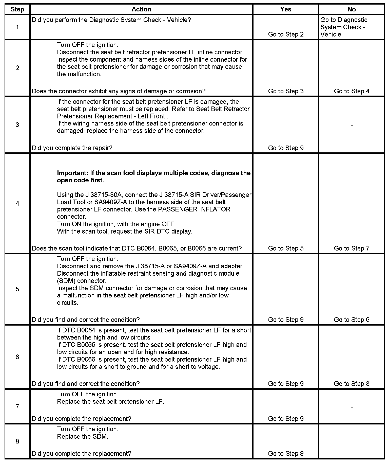 6. This step tests to see what DTCs are present. If DTC B0064 is present, test the seat belt pretensioner LF for a short between high and low circuits. If DTC B0065 is present, test the seat belt pretensioner LF high and low circuits for an open and for high resistance. If DTC B0066 is present, test the seat belt pretensioner LF high and low circuits for a short to ground and for a short to voltage.