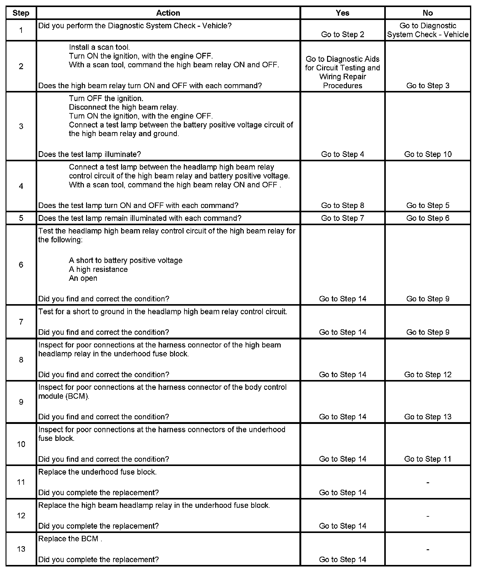 * When the BCM does not activate the high beam relay and the headlamp high beam relay control circuit is shorted to ground