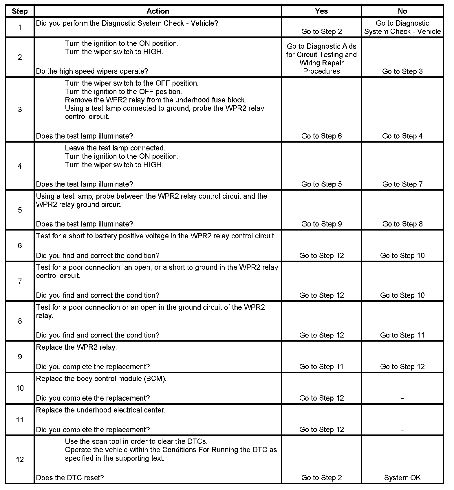 The body control module (BCM) controls and monitors the state of the WPR2 relay control circuit. When the windshield wiper switch is placed in to a high speed setting, a signal is applied to the BCM through the windshield wiper switch high signal circuit. The BCM then applies battery positive voltage to the WPR2 relay through the WPR2 relay control circuit. This energizes the WPR2 relay, allowing battery positive voltage to be applies from the FRT WPR fuse, through the switched contacts of the WPR1 relay and through the switched contracts of the WPR2 relay to the windshield wiper motor. Ground is applied at all times to the coil side of the WPR2 relay and to the windshield wiper motor from G200.