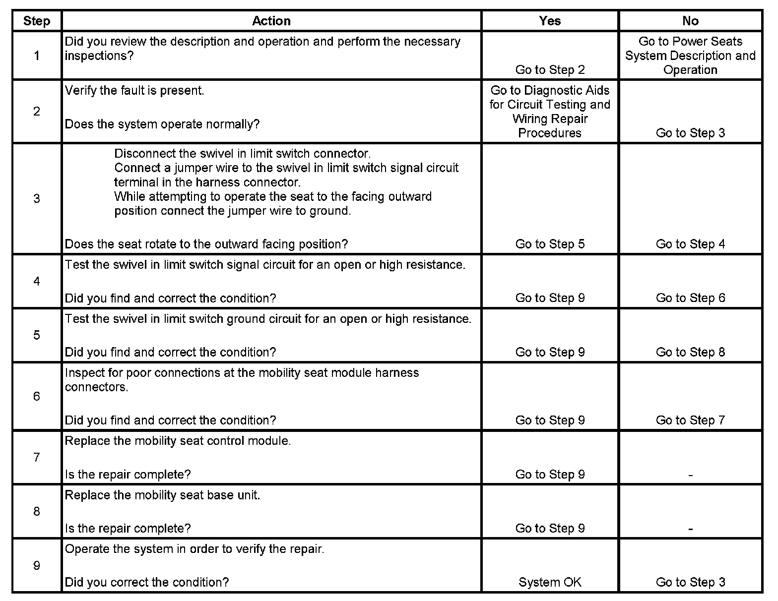 The mobility seat module uses inputs from 4 limit switches in order to determine the seat position. The limit switch signal circuits are referenced from battery voltage within the module. The limit switches will open or close the switch signal circuits to ground in order for the module to determine them to be active or inactive. The swivel in limit switch signal circuit is considered to be active when the circuit reference voltage is high or open to ground by the switch.