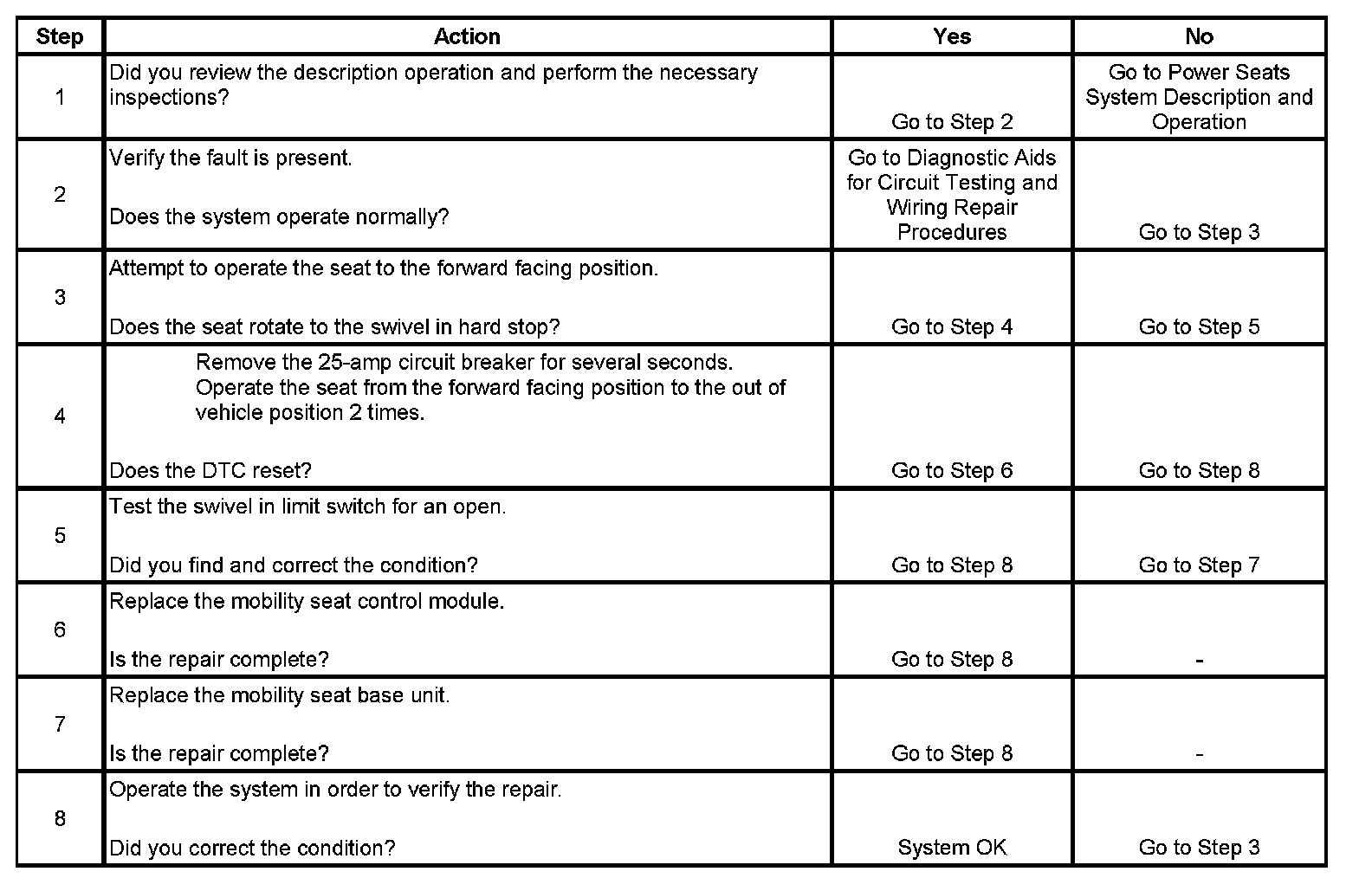 While the fault is current the module will not allow the seat to be extended outward but will allow rotation inward to the forward facing position.