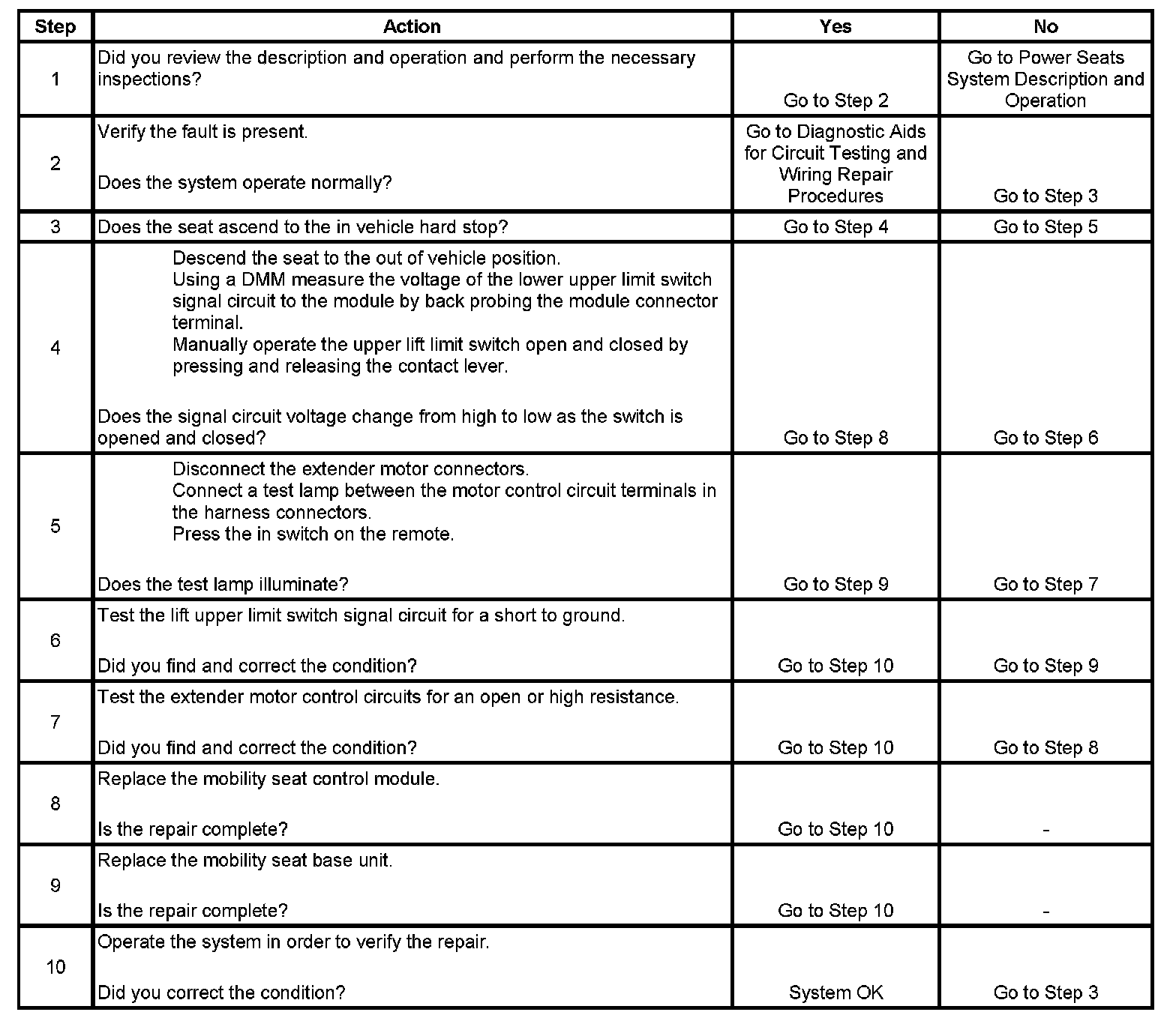 The mobility seat module uses inputs from 4 limit switches in order to determine the seat position. The limit switch signal circuits are referenced from battery voltage within the module. The limit switches will open or close the switch signal circuits to ground in order for the module to determine them to be active or inactive. The lift upper limit switch signal circuit is considered to be active when the circuit reference voltage is high or open to ground by the switch.