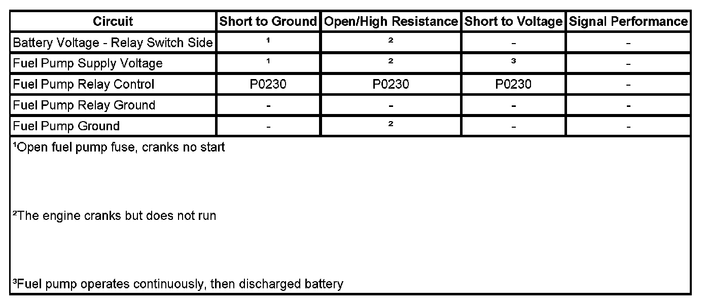 The control module monitors the voltage on the fuel pump relay control circuit. If the control module detects an incorrect voltage on the fuel pump relay control circuit, a fuel pump relay control DTC sets.
