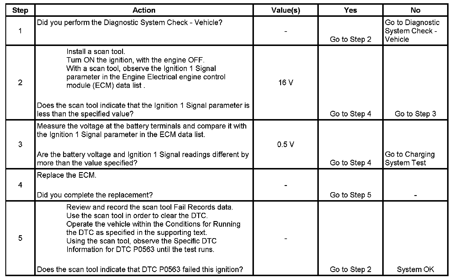 The engine control module (ECM) monitors the system voltage to ensure that the voltage stays within the proper range. Damage to components, and incorrect input can occur when the voltage is out of range. The ECM monitors the system voltage over an extended length of time. If the ECM detects an excessively high system voltage, DTC P0563 will set.