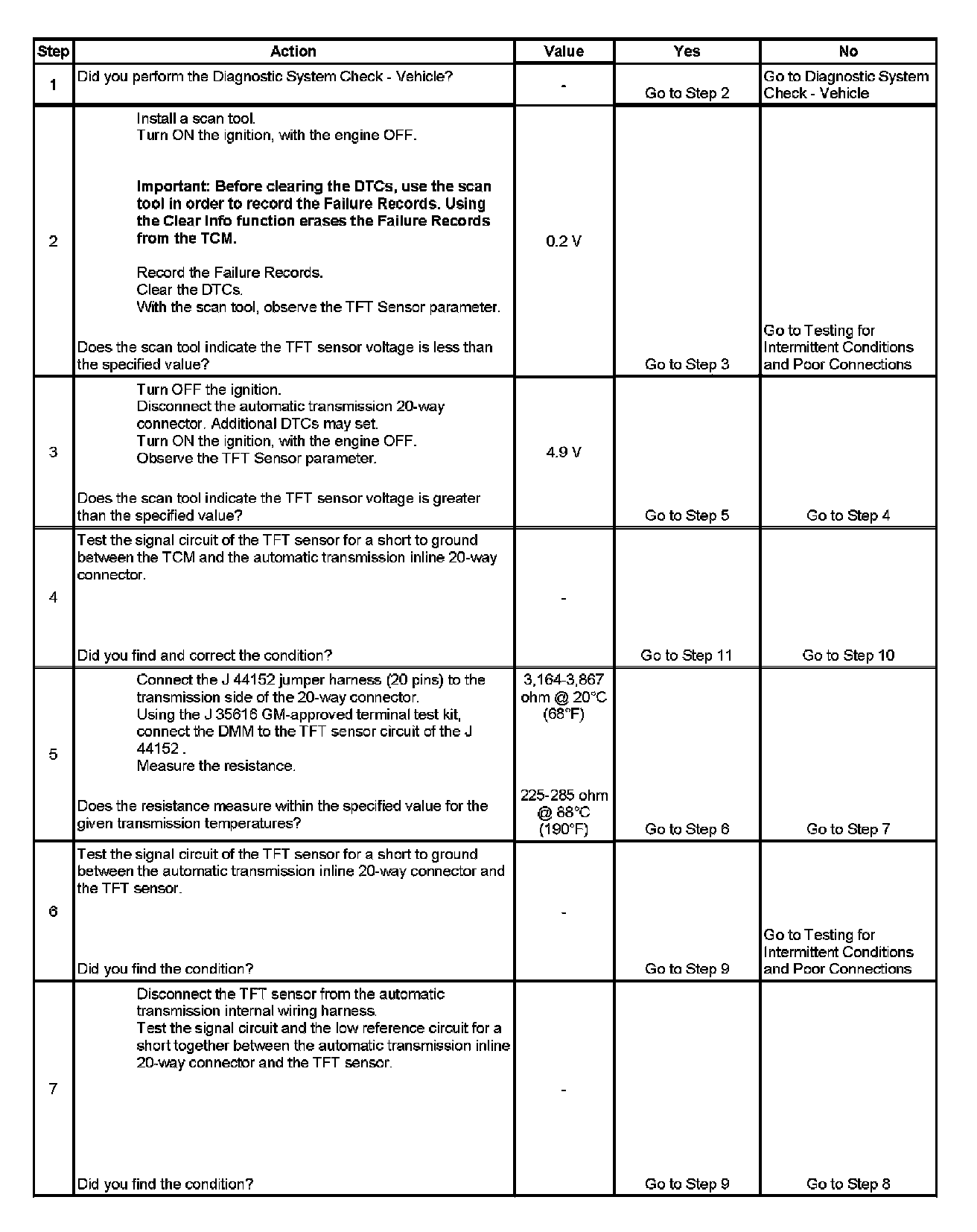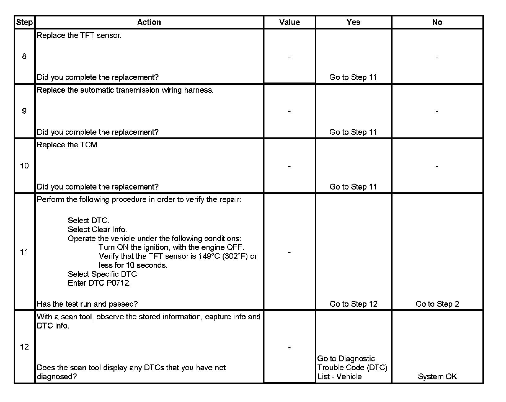 If the TCM detects a continuous short to ground in the TFT sensor signal circuit, then DTC P0712 sets. DTC P0712 is a type C DTC.