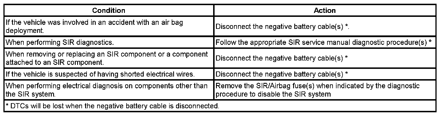 There are several reasons for disabling the SIR system, such as repairs to the SIR system or servicing a component near or attached to an SIR component. There are several ways to disable the SIR system depending on what type of service is being performed. The following information covers the proper procedures for disabling/enabling the SIR system.