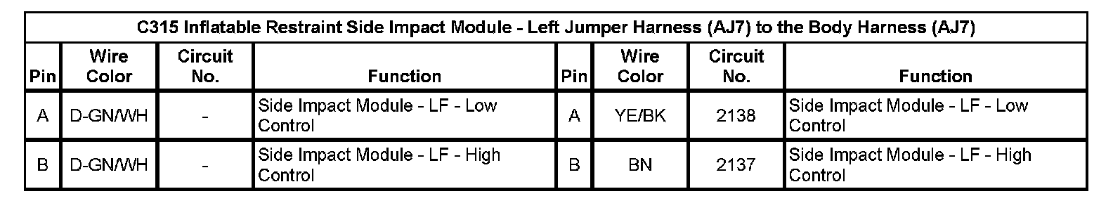 C315 Inflatable Restraint Side Impact Module - Left Jumper Harness (AJ7) to the Body Harness (AJ7)