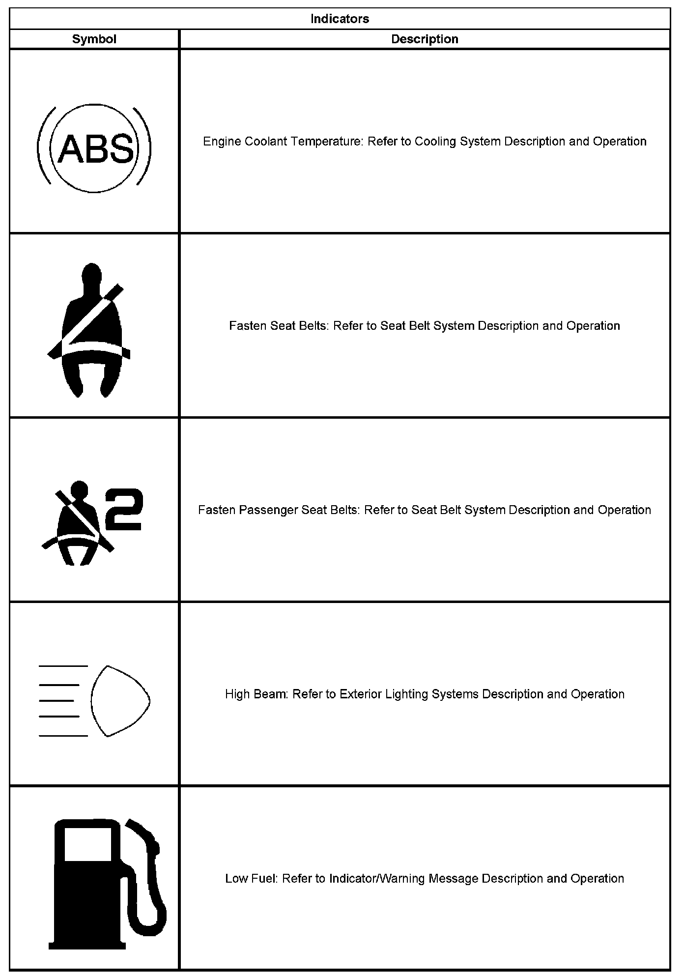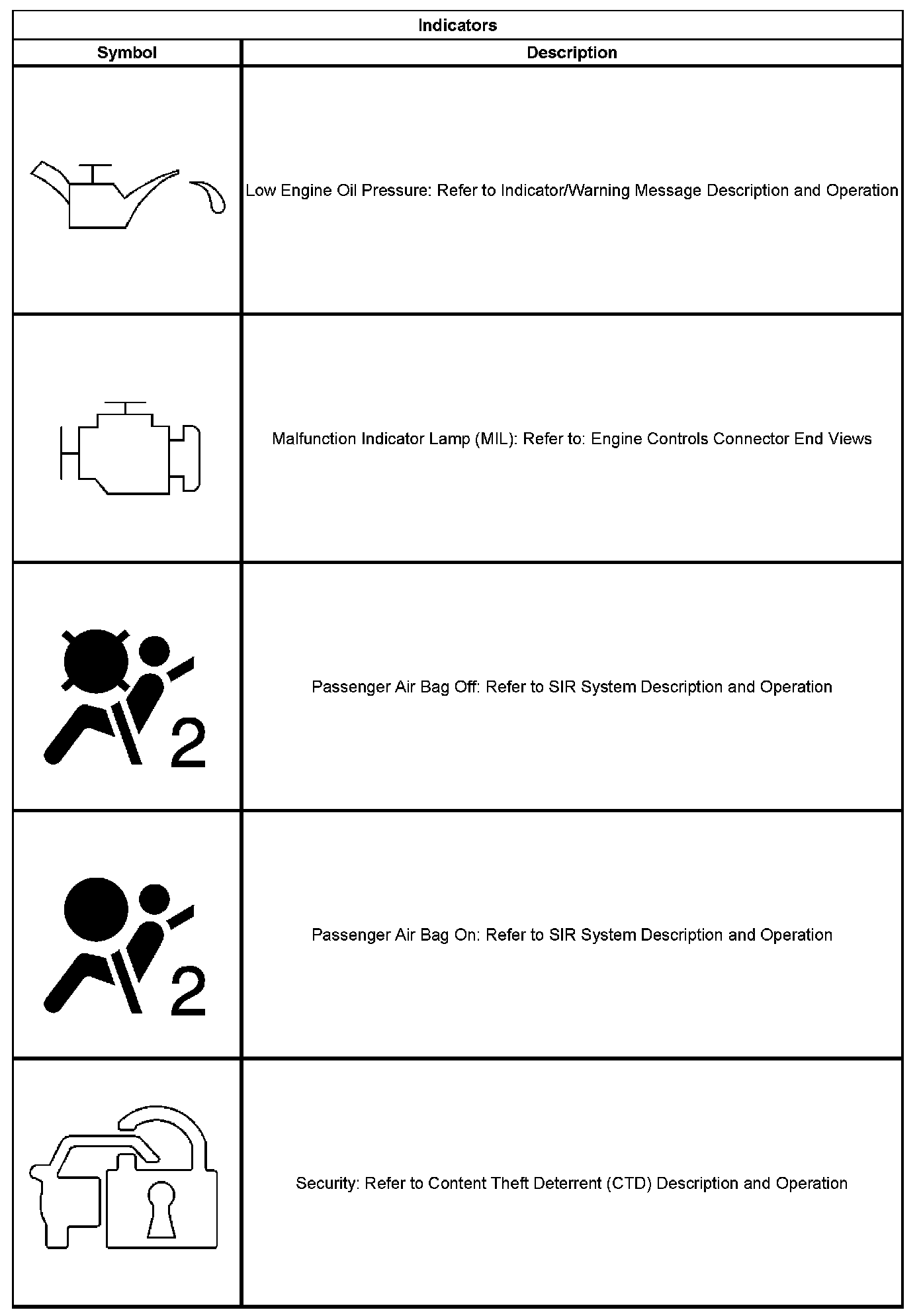 The instrument panel cluster (IPC) illuminates the LOW ENGINE OIL PRESSURE indicator in the IPC when the engine control module (ECM) detects low engine oil pressure, and the signal circuit is low. The IPC receives a class 2 message requesting the indicator illumination from the ECM.