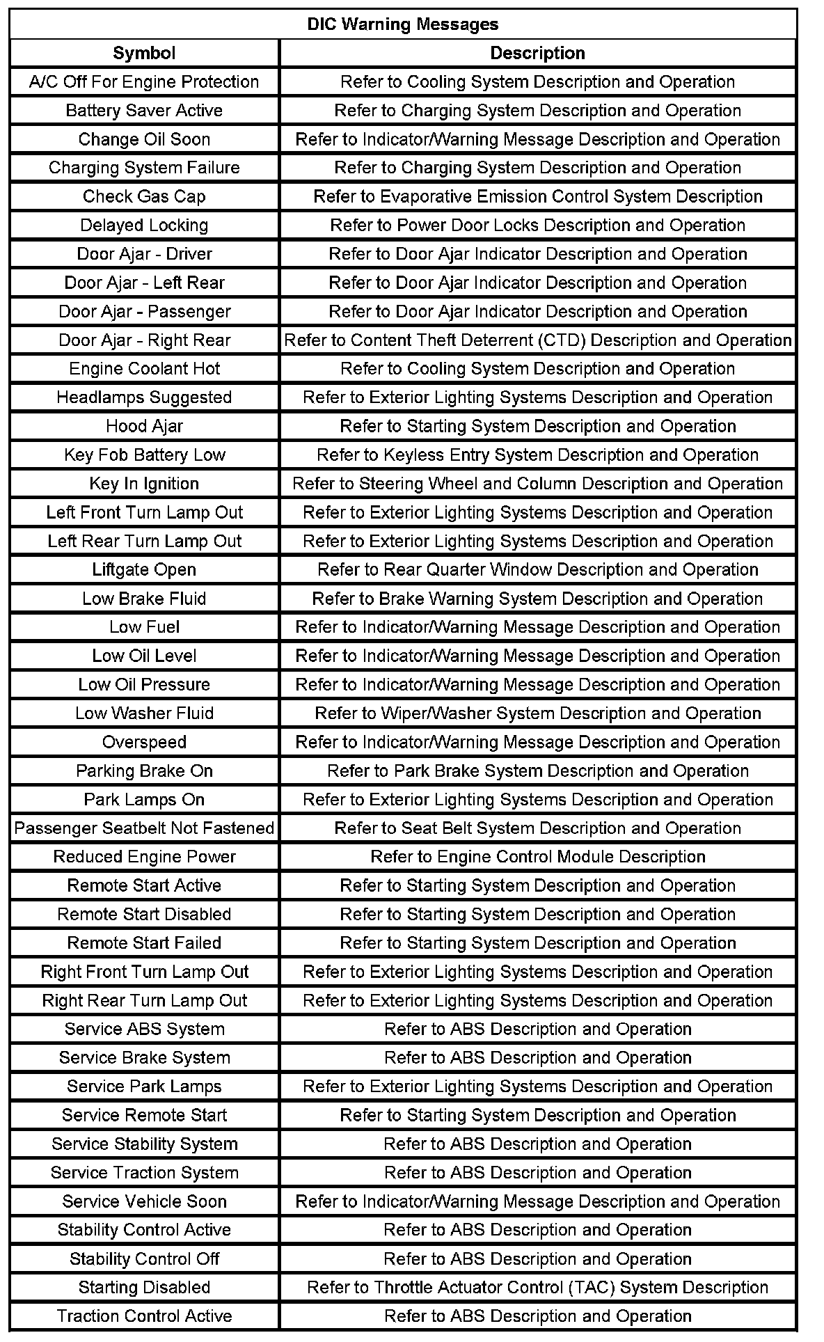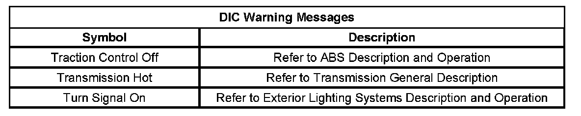 The driver information center (DIC) illuminates the SERVICE VEHICLE SOON indicator when the engine control module (ECM) detects certain malfunctions that are not related to the emissions system. The DIC receives a class 2 message requesting warning message illumination from the ECM.