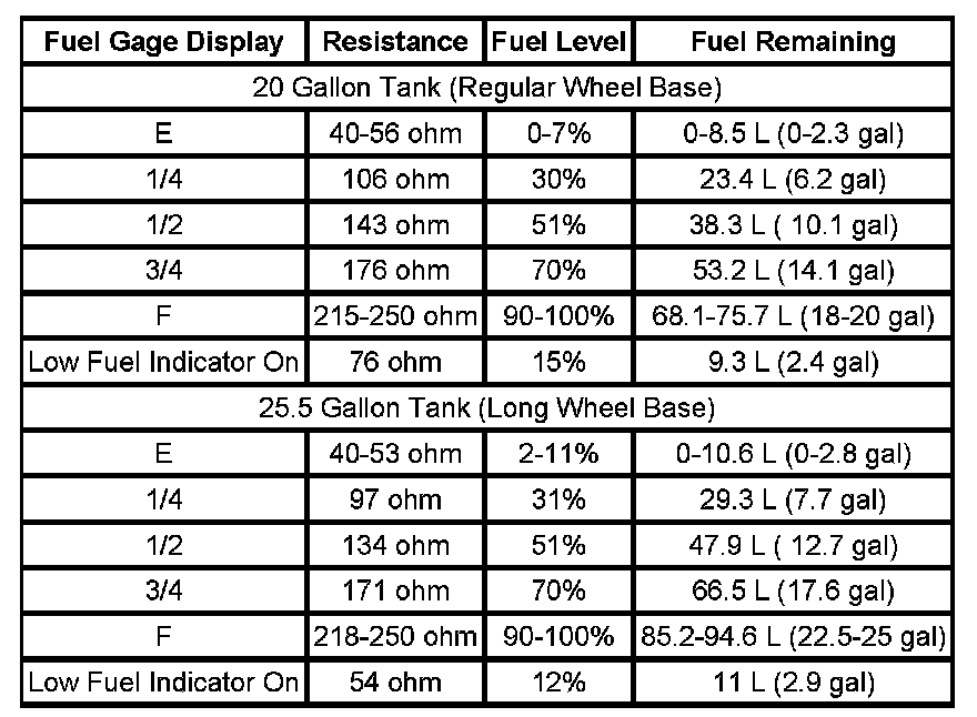 The information in this table is intended for use with the J 33431-C Signal Generator and Instrument Panel Tester. The fuel level sensor values represent the test values to be used on the Signal Generator to drive the fuel gage display to the indicated positions. Vehicles that require more than one fuel level sensor calculate gage position from many possible resistance combinations of fuel levels between the two tanks. Therefore, the values in the table may not correlate directly to readings taken from the vehicle primary or secondary sending units.