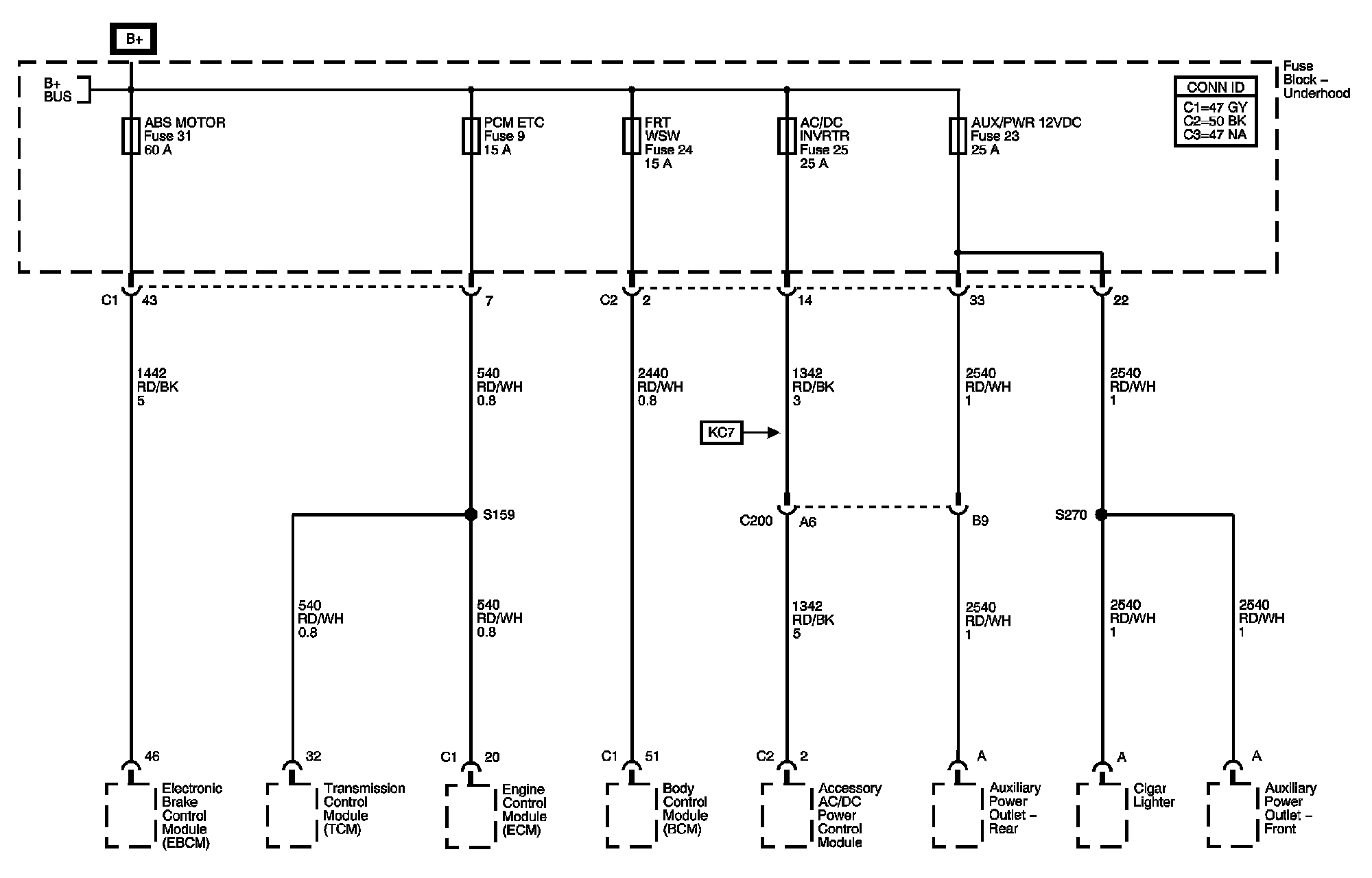 ABS MOTOR, AC/DC INVRTR, AUX/PWR 12VDC, FRT WSW, and PCM Fuses