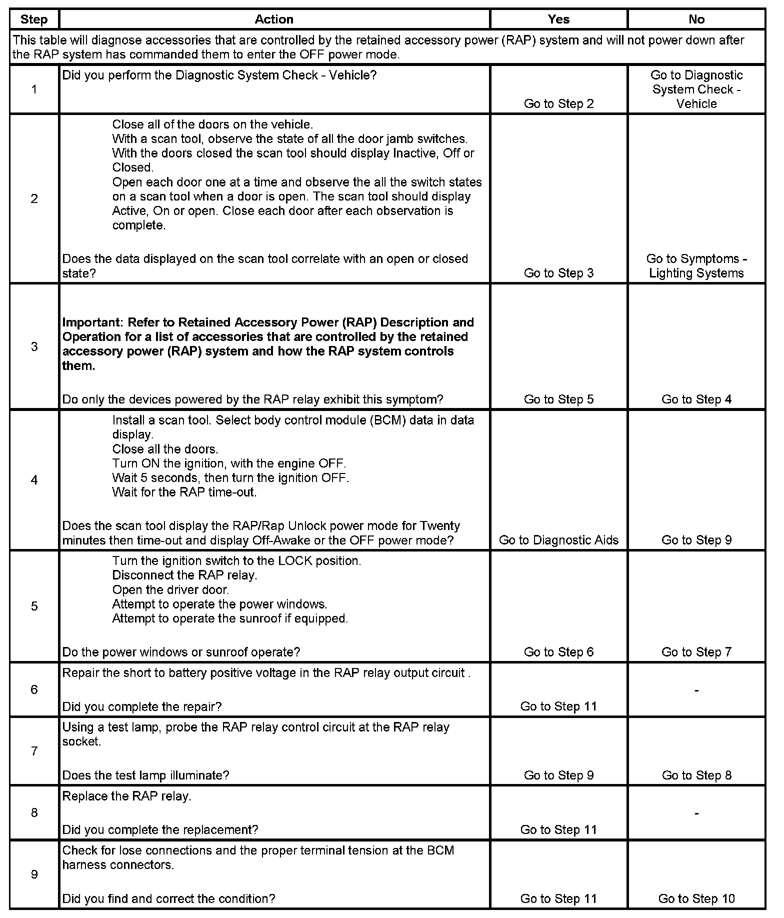 This table is used for all retained accessory power (RAP) relay and RAP serial data controlled accessories which remain active after RAP has timed out. The RAP relay system can malfunction separately from the serial data controlled RAP system and the serial data controlled RAP system can malfunction separately from the RAP relay. If multiple accessories are not exhibiting an :