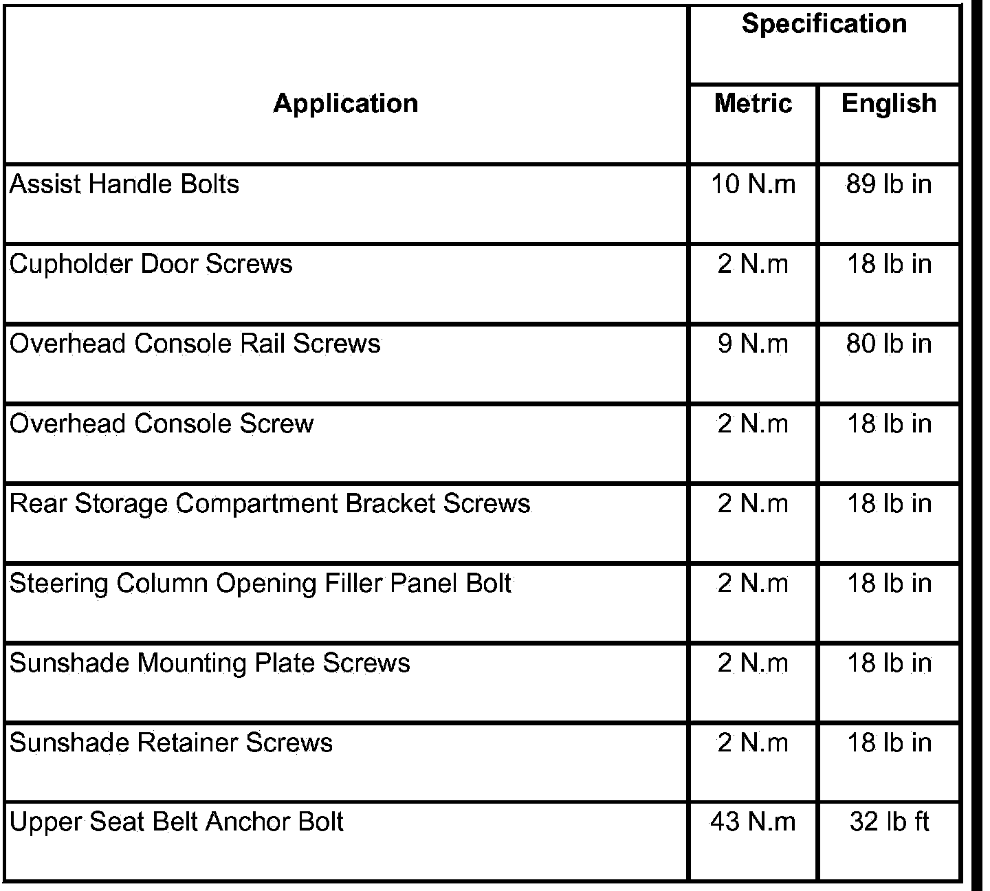 Interior Trim and Paneling - Fastener Tightening Specifications