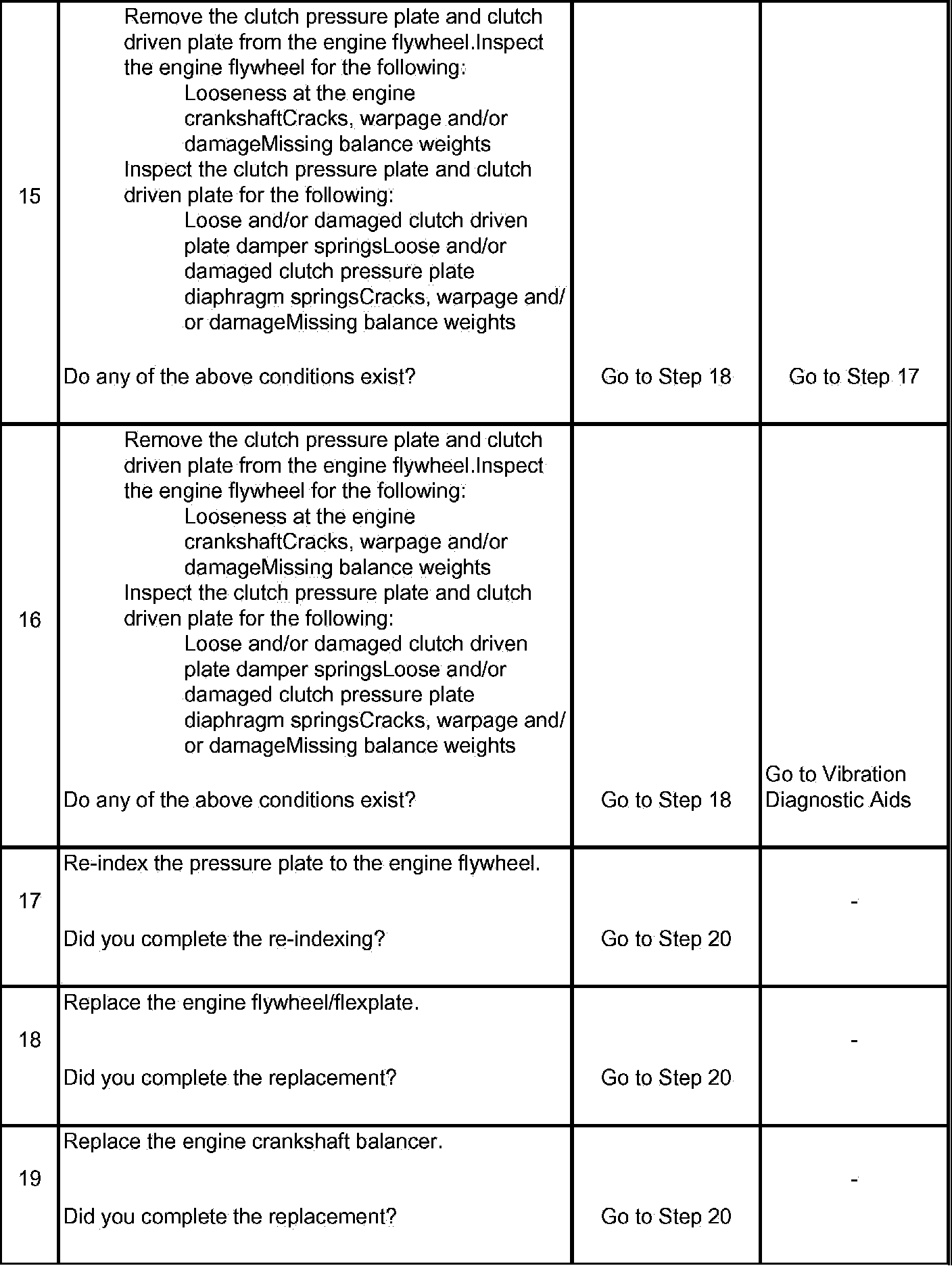 15. An engine flywheel that is loose at the engine crankshaft or that is cracked, damaged and/or missing balance weights; and/or a clutch pressure plate and clutch driven plate that has loose springs, cracks, warpage, damage and/or missing balance weights - can produce a disturbance when their mass is combined.