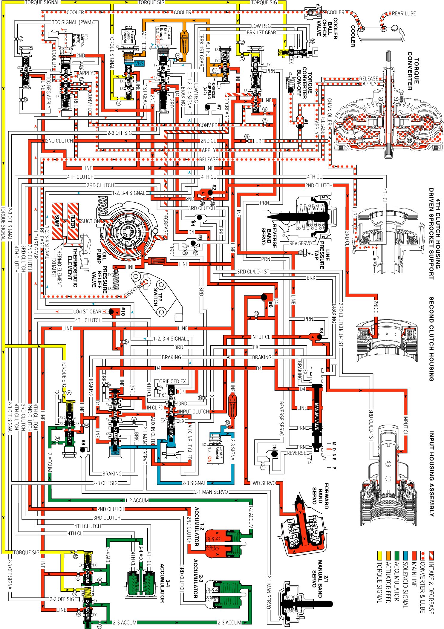 2nd fluid is routed to the TCC control PWM solenoid. Under normal operating conditions the TCC control PWM solenoid is OFF in Second gear and blocks 2nd fluid from entering the TCC signal fluid circuit.