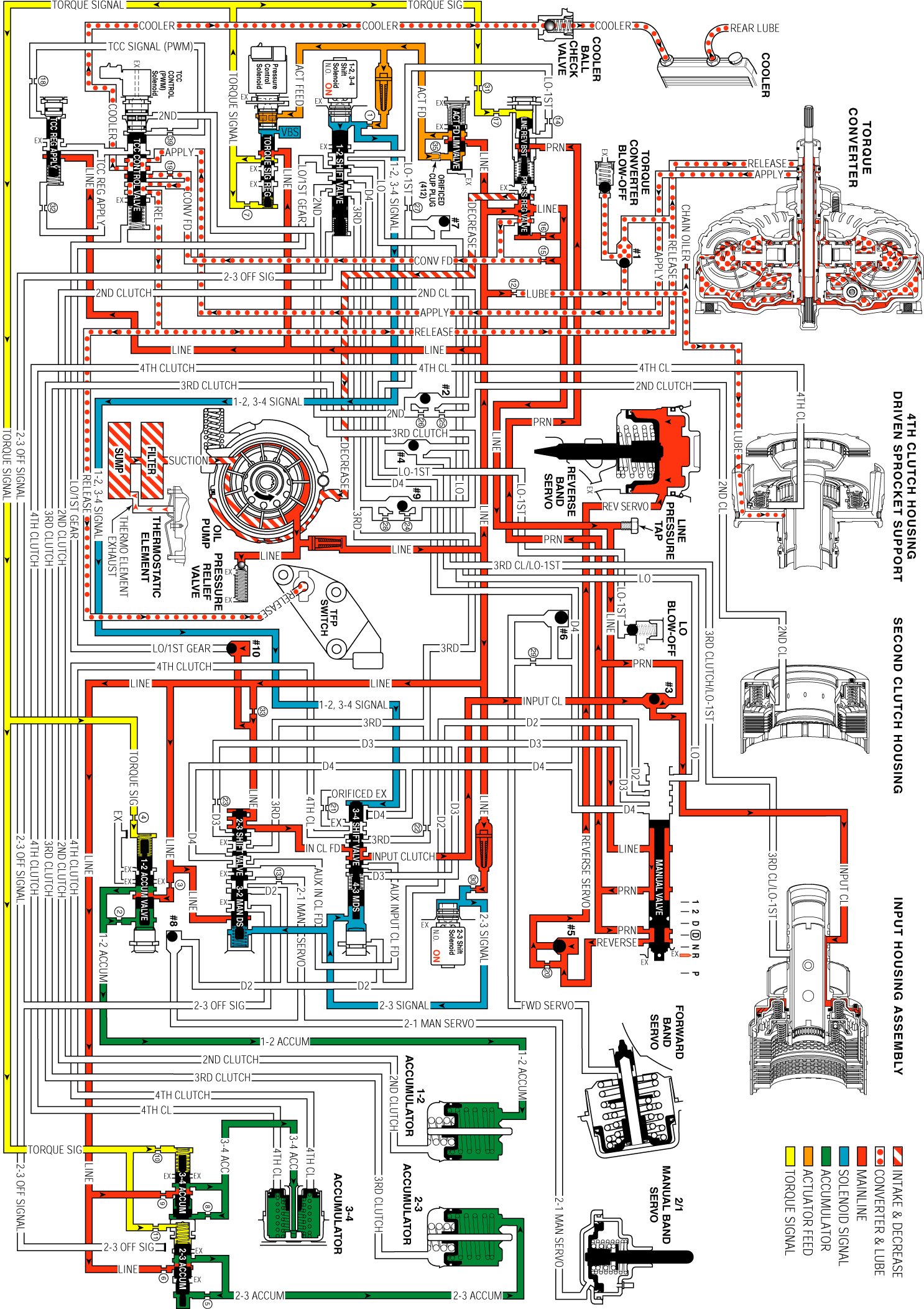 Spring pressure holds the valve in the released position. Converter feed fluid is directed to the release circuit. Release fluid seats #1 ball check valve and feeds the TCC blow-off. Release fluid feeds the TCC on the cover side of the pressure plate, exits the TCC through the apply circuit, then feeds the cooler circuit at the TCC control valve. Cooler fluid passes through the ball check valve, through the cooler, then returns to the transmission and feeds the rear lube circuit. A front lube circuit is fed from orificed line pressure.