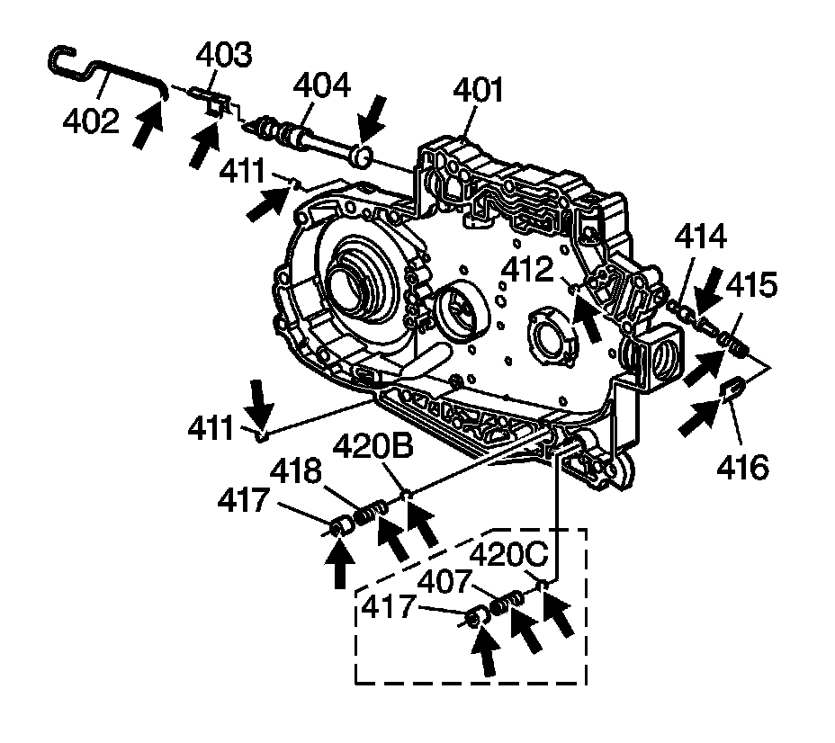7. Inspect the manual valve (404), the manual valve link (402) and the manual valve clip (403) for damage.