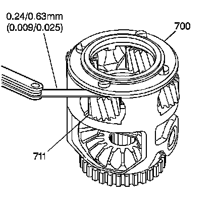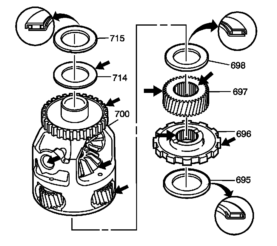 * Damaged internal gear/parking gear thrust bearing (695), differential carrier/sun gear thrust bearing (698) or differential carrier/case thrust bearing (715)