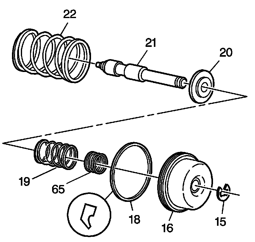 2. Assemble the servo piston (16), the servo piston cushion outer spring (19), the servo piston cushion inner spring (65), the servo cushion spring retainer (20) and the servo piston apply pin (21).
