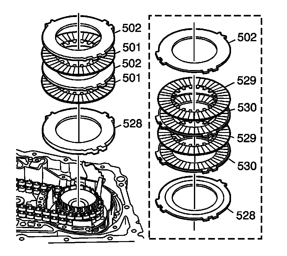 6. Install the remaining fourth clutch plates, starting with a fiber plate assembly (501) and alternating with steel plates (502). Some models use fiber on one side of each inner and outer plate (529, 530). Install with the fiber side up.