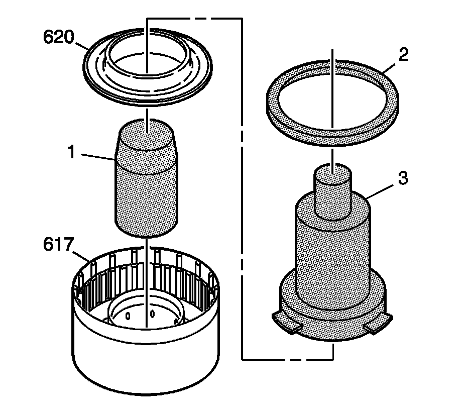 2. Install the second clutch piston (620) and J 41992-3 (3) into J 41992-1 (2) protector.