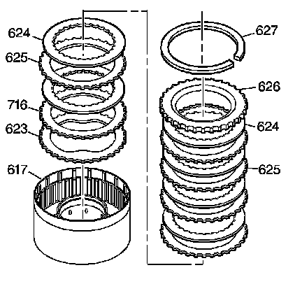 3. Remove the second clutch apply plate (716). Remove the second clutch waved plate (623).