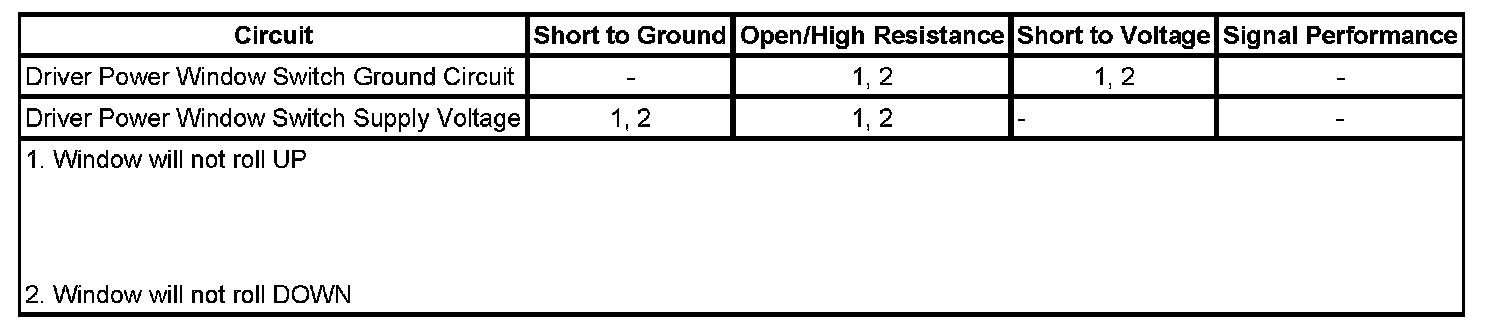 • If the driver window fails to roll down or up, refer to Power Windows Inoperative - One or Both Front Windows. Power Windows Inoperative - One or Both Front Windows