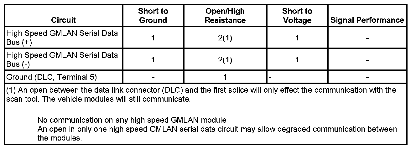 - Any of the high speed GMLAN serial data circuits shorted to ground or voltage