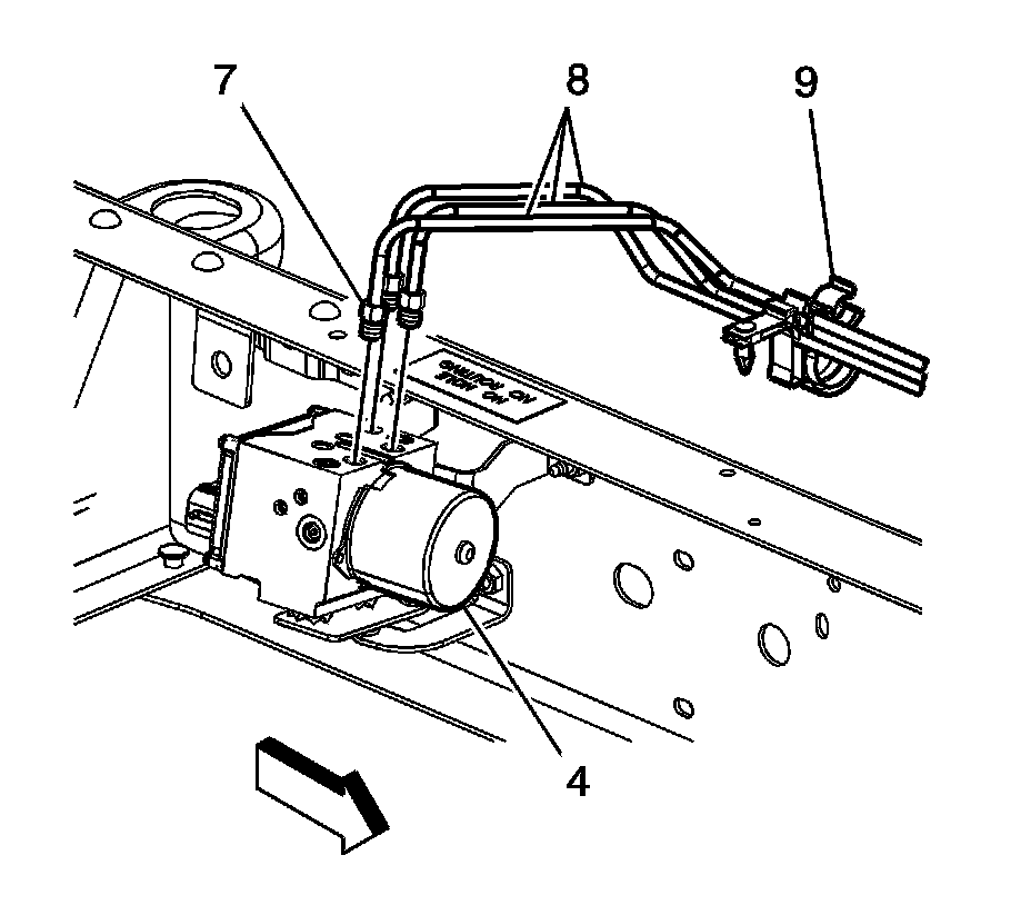 8. Position the brake pipes (8) to the BPMV (4) and secure the retaining clip (9).