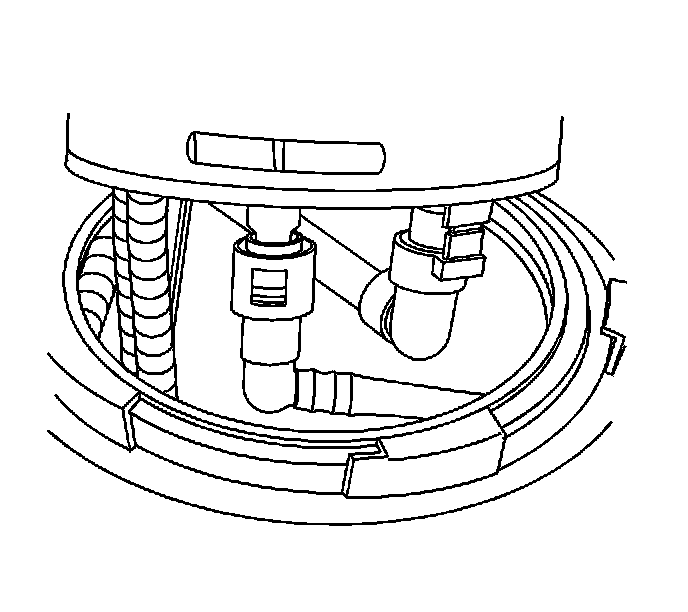 27. Carefully lift the module from the fuel tank, enough to access the quick connect fitting under the module cover. Disconnect the quick connect fitting.
